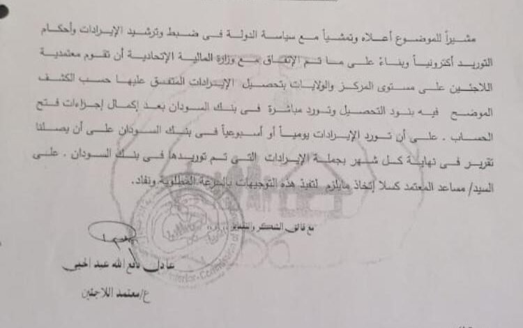 وأشارالتقرير الي انه تم تجنيب المبالغ المتحصلة عبر التحصيل الإلكتروني و الصرف منه بمكتب مساعد المعتمد بكسلا، وبعلم رئاسة المعتمدية وتحت إشراف مدير الشؤون المالية و الإدارية السابق المتهم في بلاغات فساد و بهندسة مساعد المعتمد السابق بكسلا.